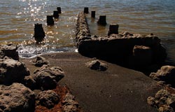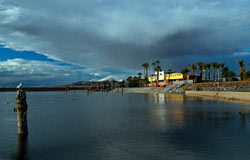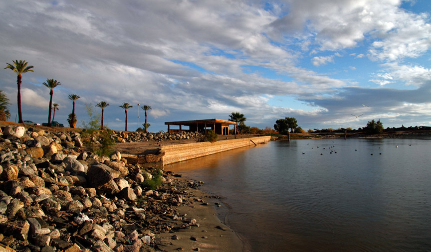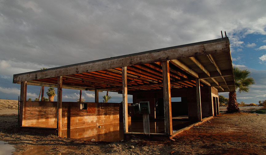Bombay Beach is a small town on the east shore of the Salton Sea, the ruins of Bombay Beach attract many photographers and visitors. Sunken trailer park - at the south end of Avenue E. In the 1980s, the water level of the Salton Sea rose and fell several times. The town of Bombay Beach was partially inundated by these fluctuations and a berm was built on the south end of town to prevent further flooding. The remains of a trailer park can be seen with some of the buildings and trailers half-buried in mud.