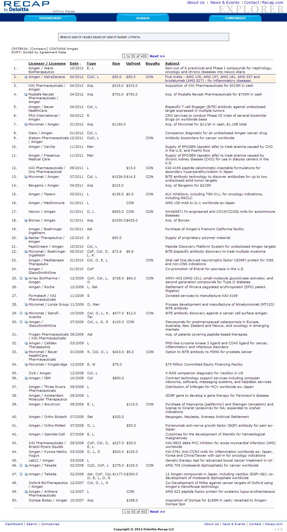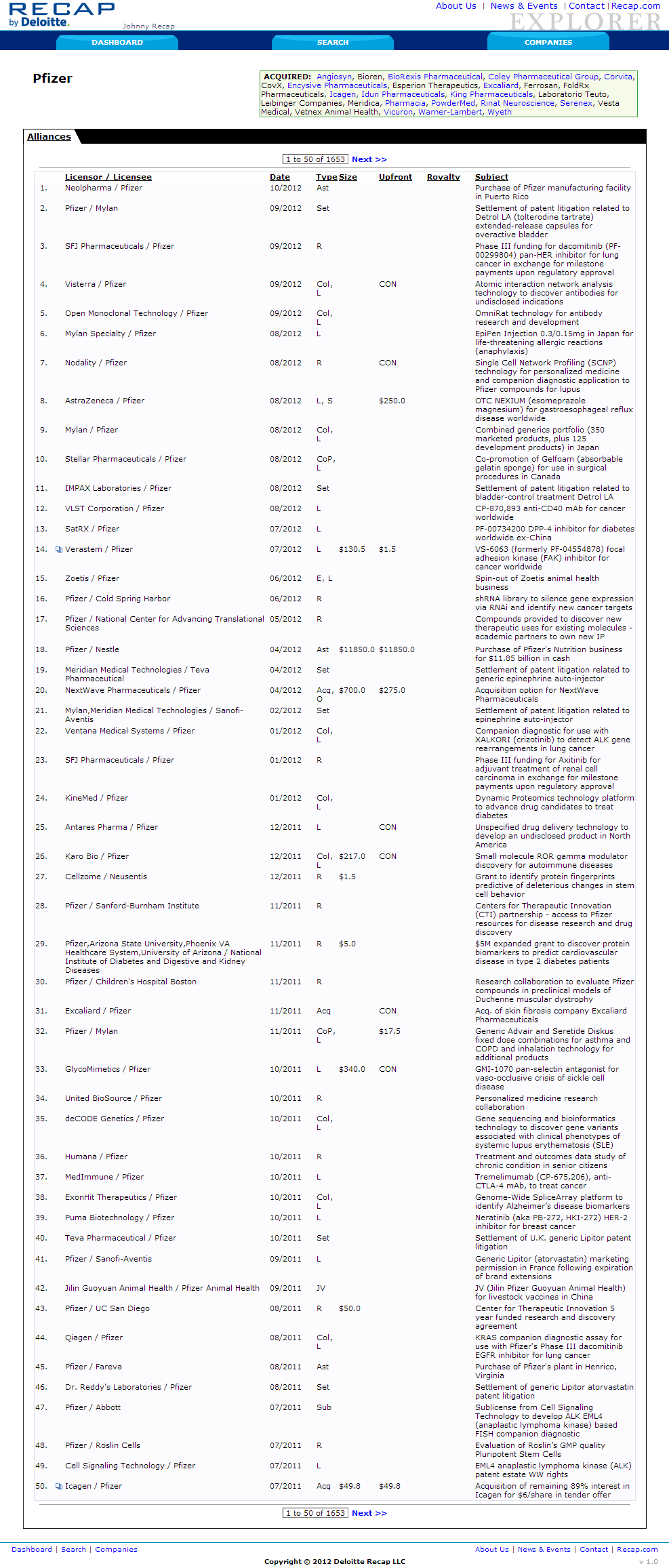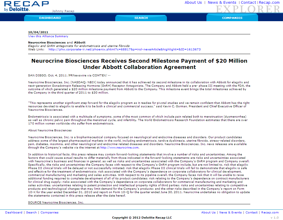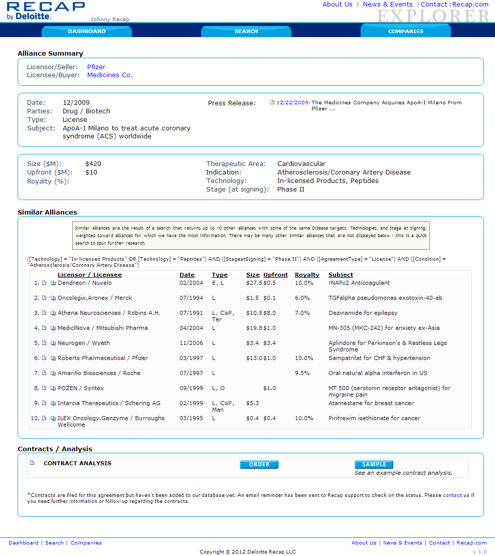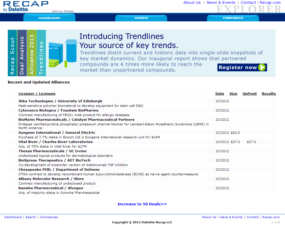 Deloitte & Touche's Life Science's division "watered down" Biotechnology and Pharmaceutical database website. Using a simpler search architecture and data presentation. This site is for clients who do not need the more powerful Recap IQ by Deloitte website.
